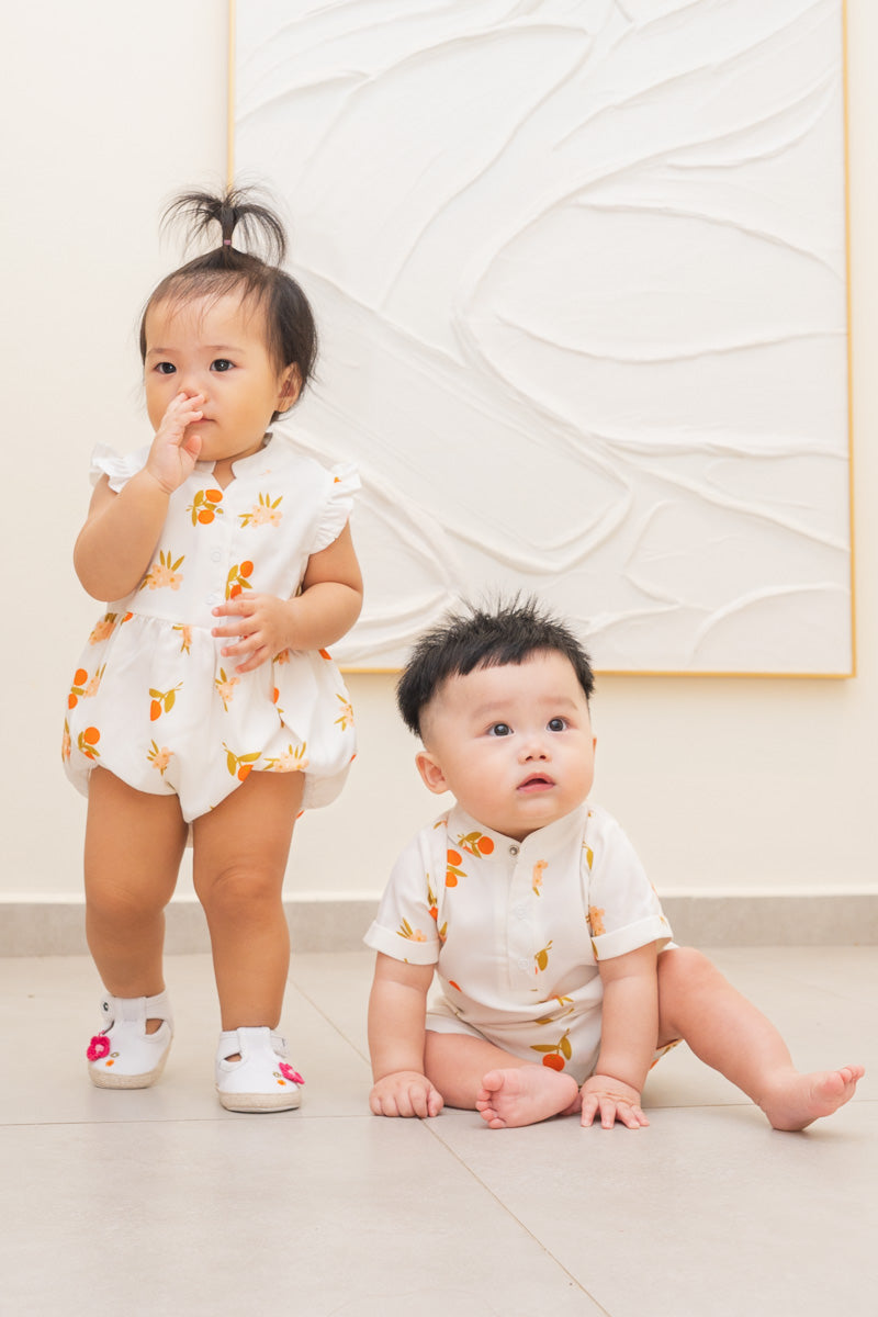 This all-in-one romper has a straight cut with upturned hems, giving a perfect finish to the romper. Featuring smart mandarin collar with snap buttons down the front for easy changing.
